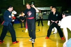 MeNatShiaiDuring the years I ran my dojo, I also participated in local tournaments. Here, Matt Borczon referees a match between me and Nathaniel Allen. Matt, Nat, and I also boxed for the Lower Eastside Fightin’ Eagles.